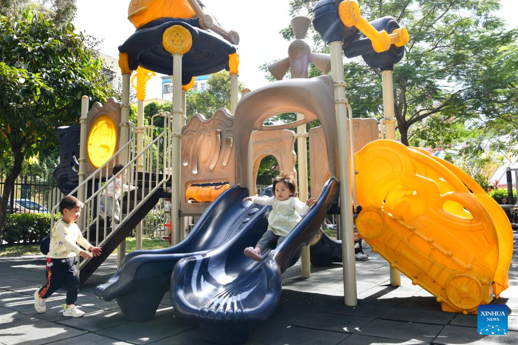 Kids play at a children's park in Shangwei Village, a child-friendly arts village, in Longhua District of Shenzhen, south China's Guangdong Province, Nov. 19, 2023. (Xinhua/Liang Xu)