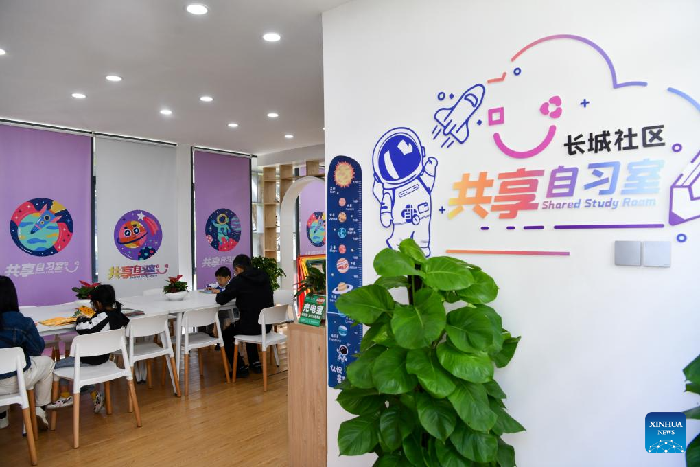Children and their parents read books at a shared study room in Changcheng community in Baihua Child-friendly Block of Futian District in Shenzhen, south China's Guangdong Province, Nov. 18, 2023. (Xinhua/Liang Xu)