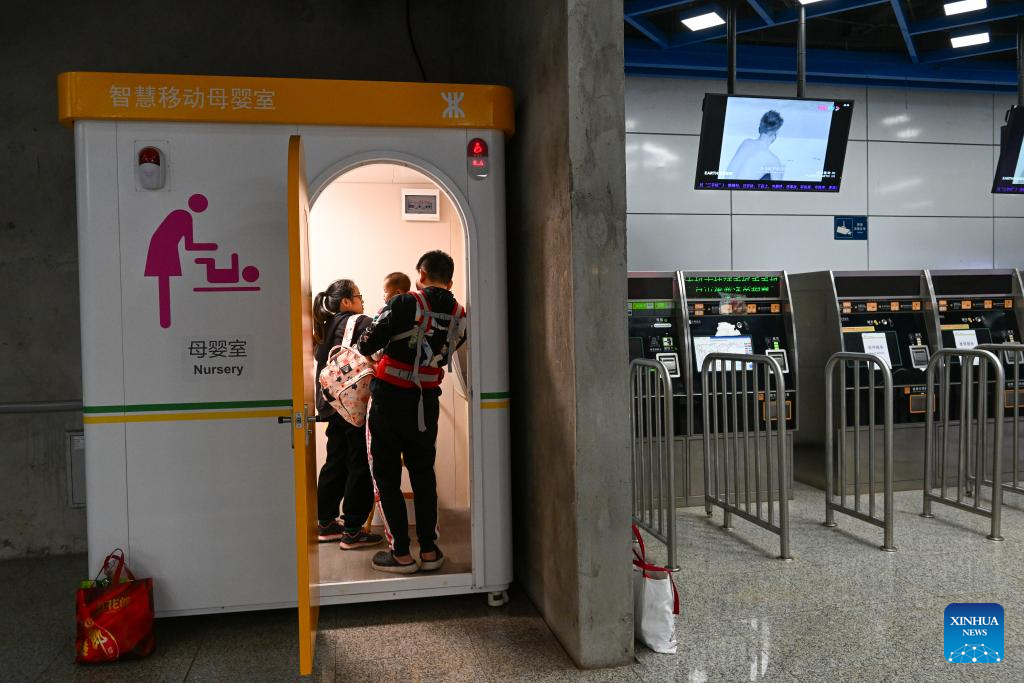 A couple change diaper for their baby at a mobile nursery within the Hongshuwan Station of Shenzhen Metro in Shenzhen, south China's Guangdong Province, Nov. 17, 2023. (Xinhua/Mao Siqian)