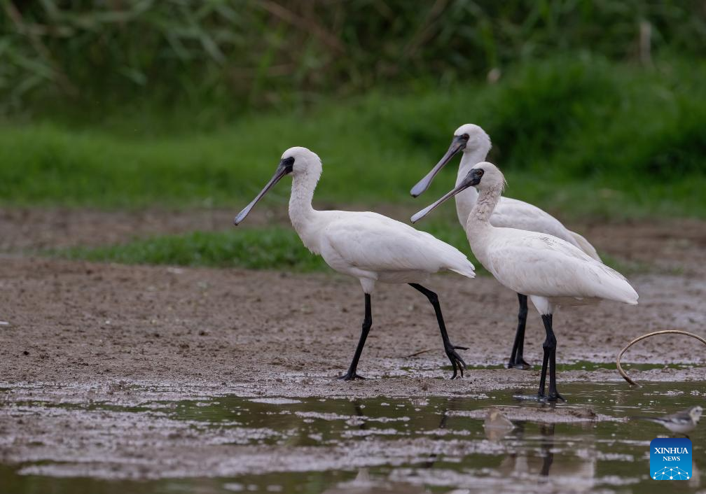 Black-faced spoonbills are pictured in the Minjiang River estuary wetland in southeast China's Fujian Province, Nov. 15, 2023. (Xinhua/Wei Peiquan)?