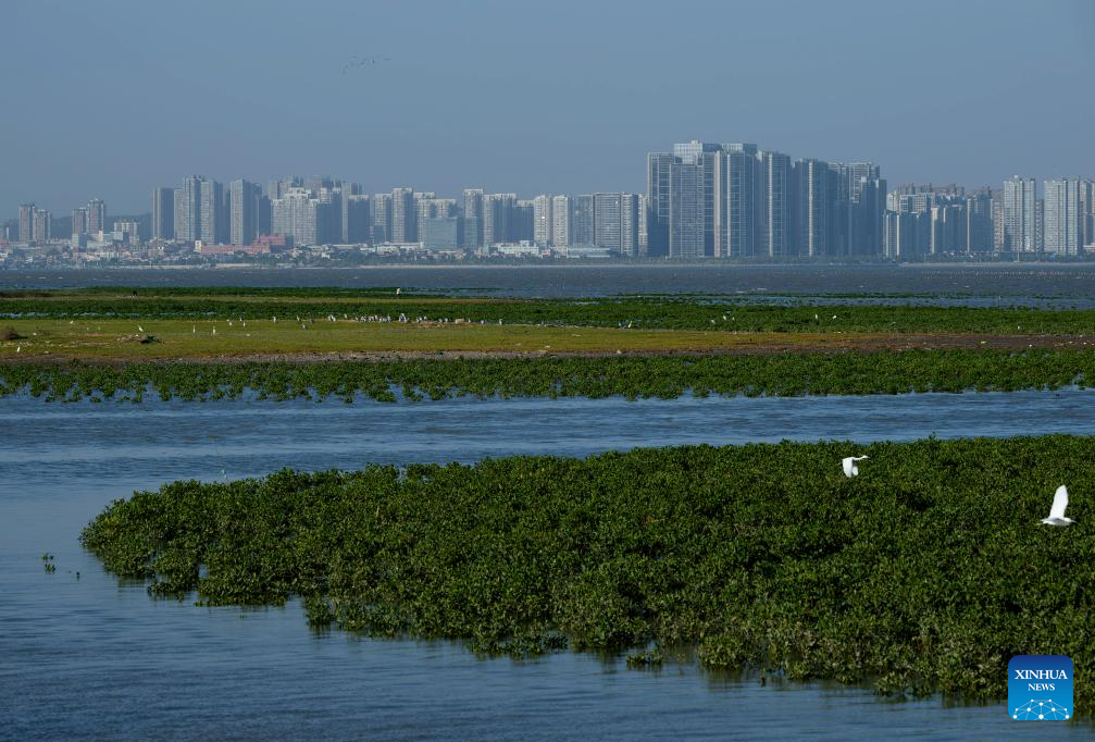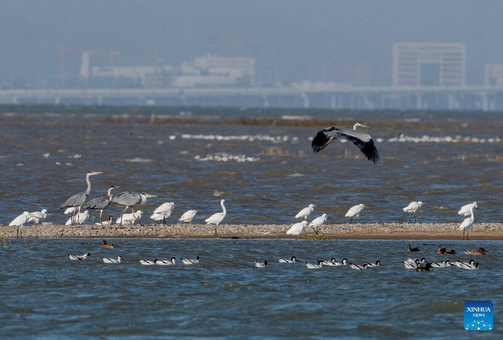 Water birds are pictured in the Quanzhou Bay estuary wetland in southeast China's Fujian Province, Nov. 18, 2023. (Xinhua/Wei Peiquan)