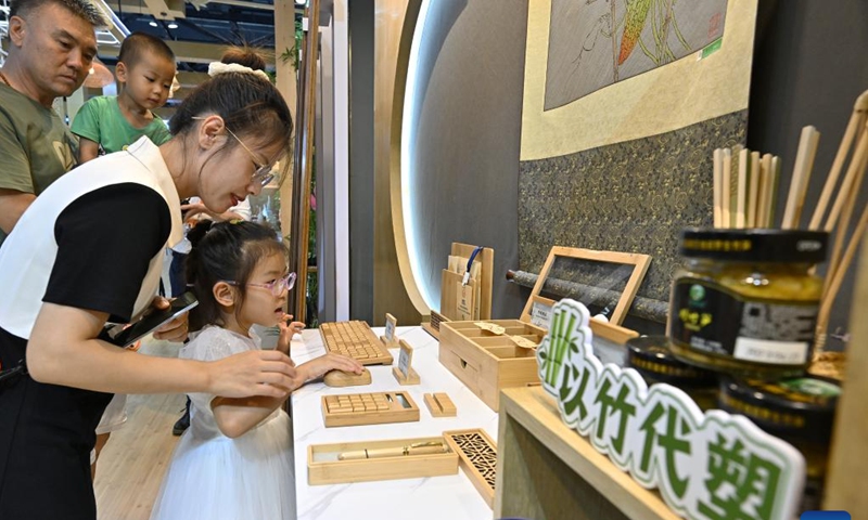 Visitors try mouse and keyboard made of bamboo at the environmental services exhibition of the 2023 China International Fair for Trade in Services (CIFTIS) in Beijing, capital of China, Sept. 2, 2023. (Photo/Xinhua)