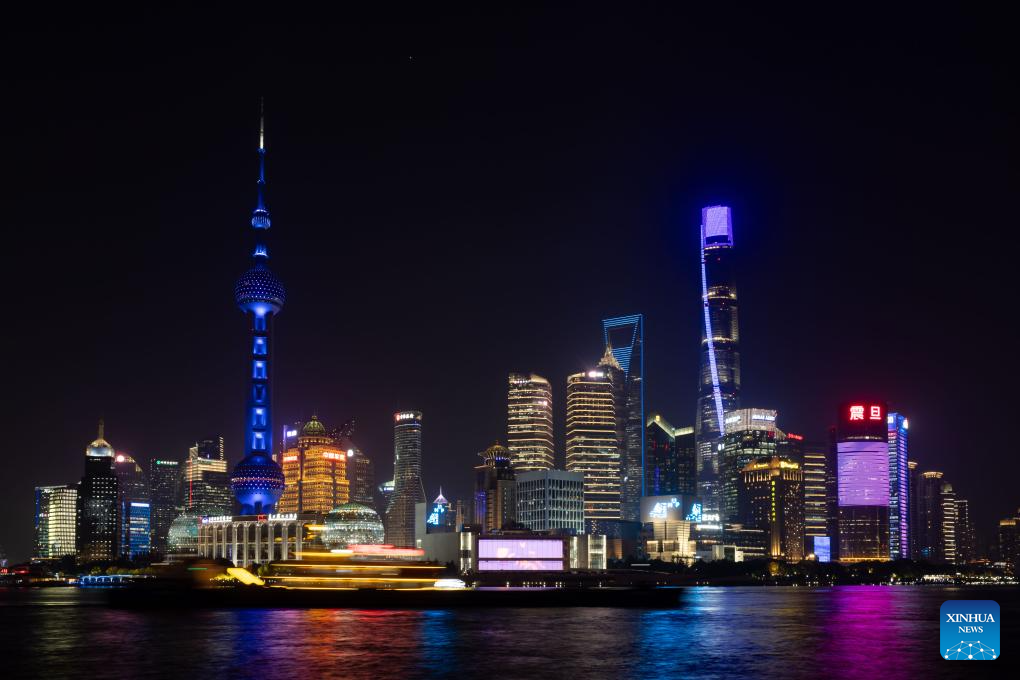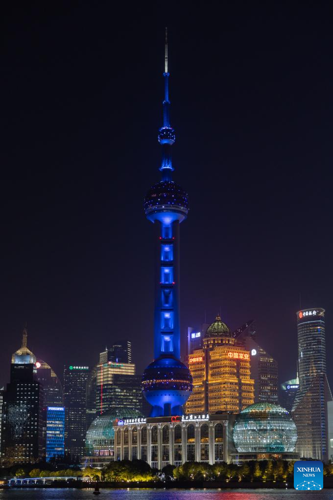 Landmarks are lit up to celebrate World Children's Day in Lujiazui area in east China's Shanghai, Nov. 20, 2023. (Xinhua/Wang Xiang)
