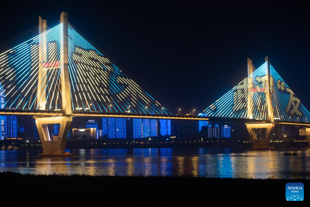 A light show is held to celebrate World Children's Day on the Second Yangtze River Bridge in Wuhan, capital of central China's Hubei Province, Nov. 20, 2023. (Photo by Du Zixuan/Xinhua)
