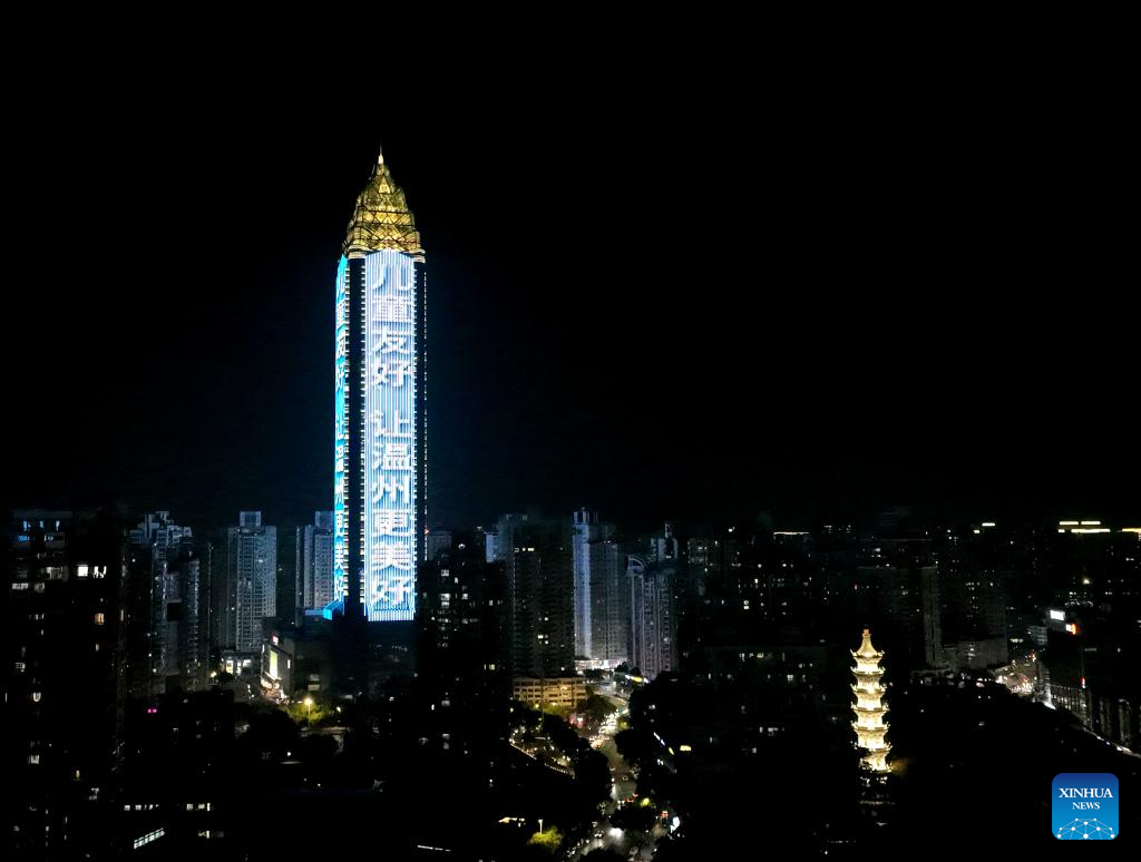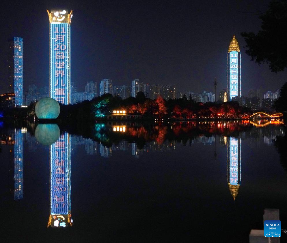 Buildings are lit up to celebrate World Children's Day in Wenzhou, east China's Zhejiang Province, Nov. 20, 2023. (Photo by Zhou Hanxiang/Xinhua)