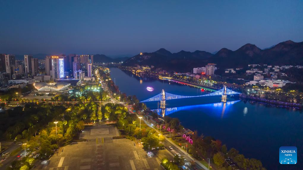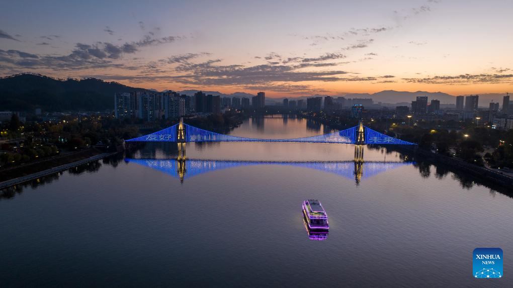 This aerial photo taken on Nov. 20, 2023 shows a bridge being lit up to celebrate World Children's Day on the Xin'an River in Huangshan City, east China's Anhui Province. (Photo by Fan Chengzhu/Xinhua)