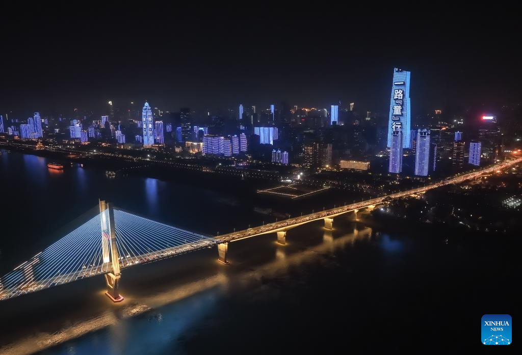 This aerial photo taken on Nov. 20, 2023 shows the Second Yangtze River Bridge and surroundings being lit up to celebrate World Children's Day in Wuhan, capital of central China's Hubei Province. (Photo by Zhao Jun/Xinhua)