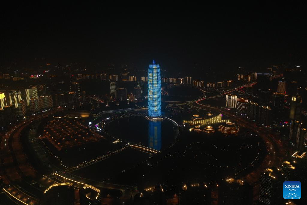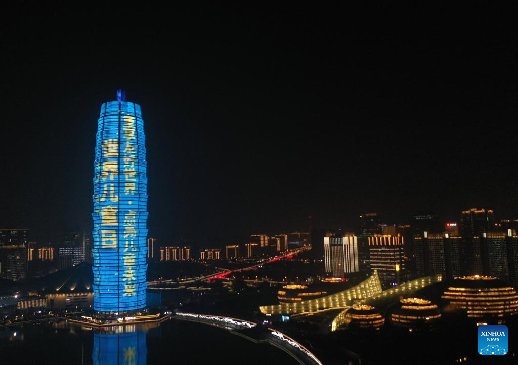 This aerial photo taken on Nov. 20, 2023 shows a building being lit up to celebrate World Children's Day at the Qianxi Square in Zhengzhou, capital of central China's Henan Province. (Xinhua/Li Jianan)