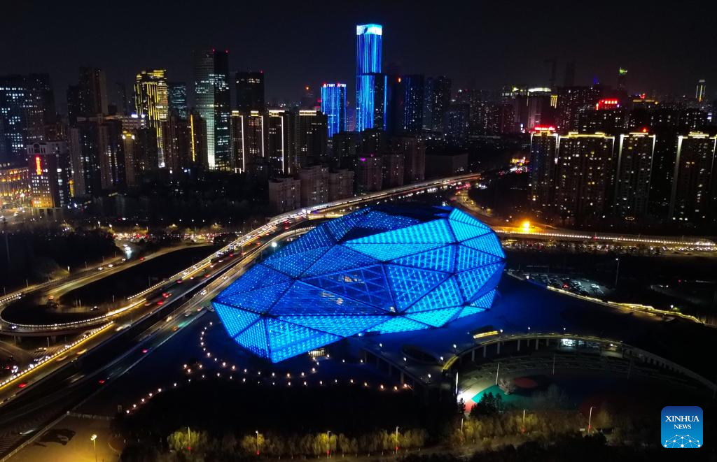 This aerial photo taken on Nov. 20, 2023 shows the Shengjing Grand Theater being lit up to celebrate World Children's Day in Shenyang, northeast China's Liaoning Province. (Xinhua/Chen Wei)