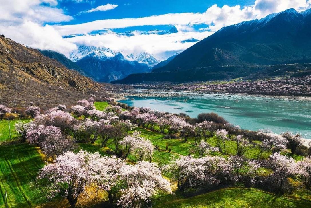 Photo taken on March 23, 2023 shows beautiful peach blossoms along the Yarlung Zangbo River in Nyingchi, southwest China's Xizang autonomous region. (People's Daily Online/Li Yanzhao)
