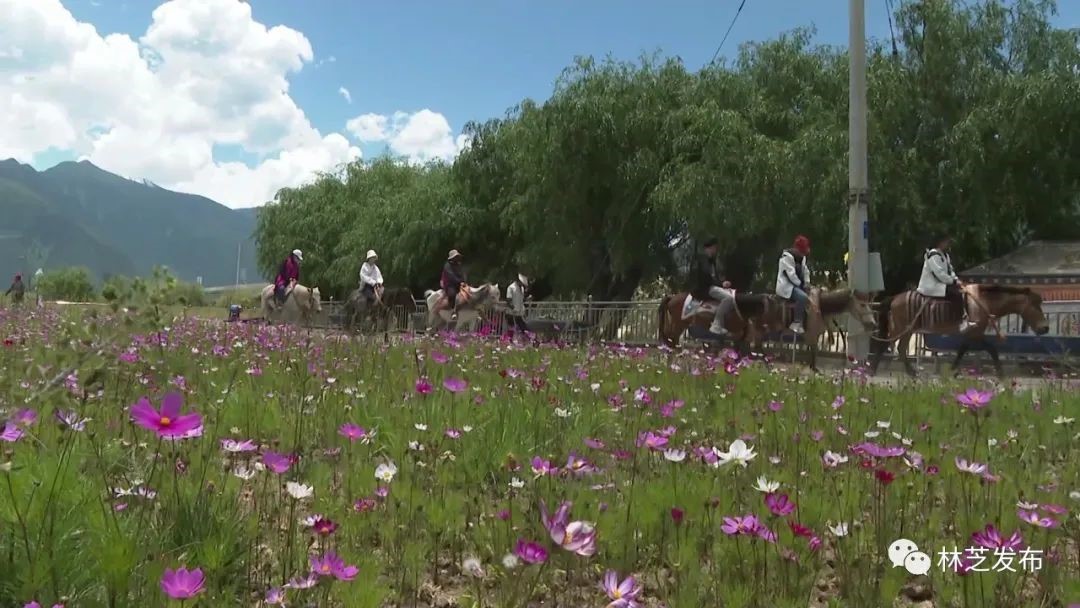 Tourists ride horses and enjoy flowers in Nyingchi, southwest China's Xizang autonomous region. (Photo from the official account of the Nyingchi Radio and TV Station on WeChat)