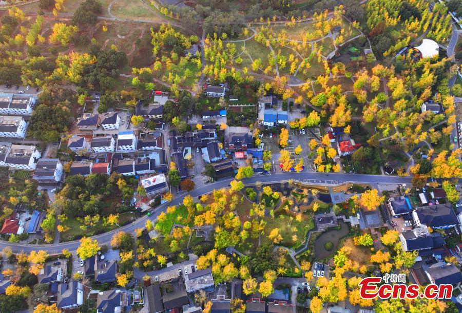 Golden ancient ginkgo trees amidst village houses become a tourist hit in Changxing County of Huzhou, east China's Zhejiang Province, Nov. 20, 2023. (Photo provided to China News Service)