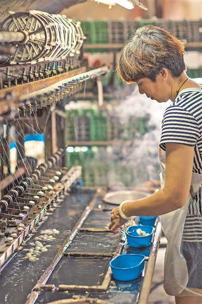 A worker operates machinery to reel silk at a factory in Zhenze township, Wujiang district, Suzhou city, east China's Jiangsu Province. (Photo courtesy of the Office of Party and Government Affairs of Zhenze township)