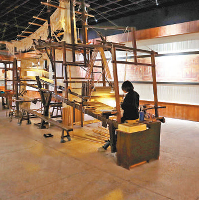 Photo shows wood weaving machines in a Song brocade culture park in Wujiang district, Suzhou city, east China's Jiangsu Province. (Photo courtesy of Wujiang Dingsheng Silk Co., Ltd.)