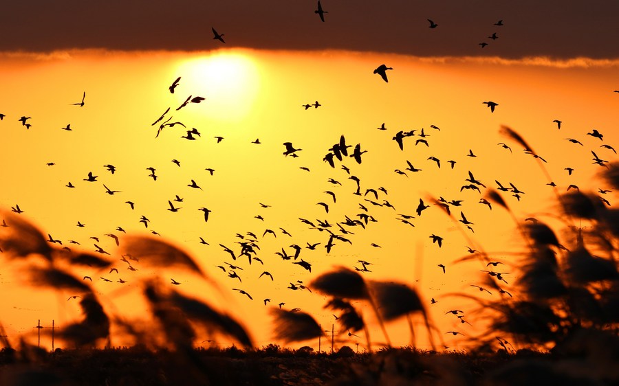 Wintering migratory birds are seen at the Yellow River Delta National Nature Reserve in Dongying, east China's Shandong Province, Nov. 12, 2023. (Xinhua/Xu Suhui)