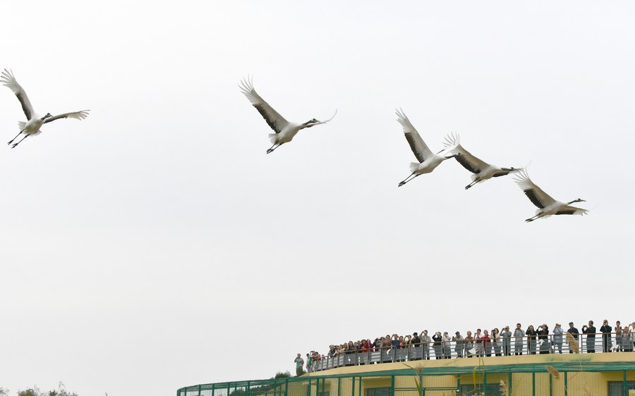 People watch red-crowned cranes at the Yellow River Delta National Nature Reserve in Dongying, east China's Shandong Province, Oct. 12, 2023. (Xinhua/Xu Suhui)
