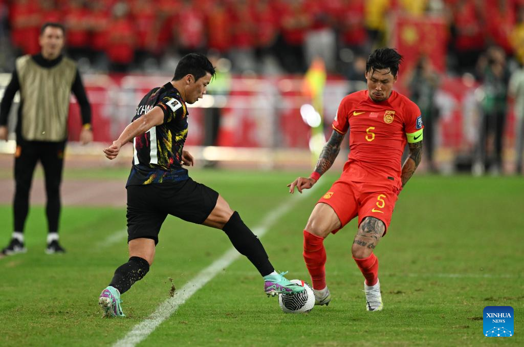 Zhang Linpeng (R) of China vies with Hwang Heechan of South Korea during the Group C match between China and South Korea at the 2026 FIFA World Cup Asian qualifier in Shenzhen, south China's Guangdong Province, Nov. 21, 2023. (Xinhua/Mao Siqian)