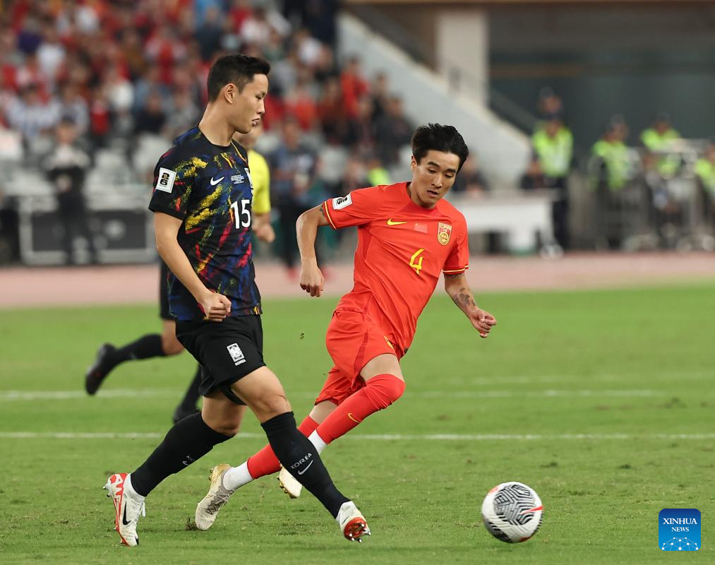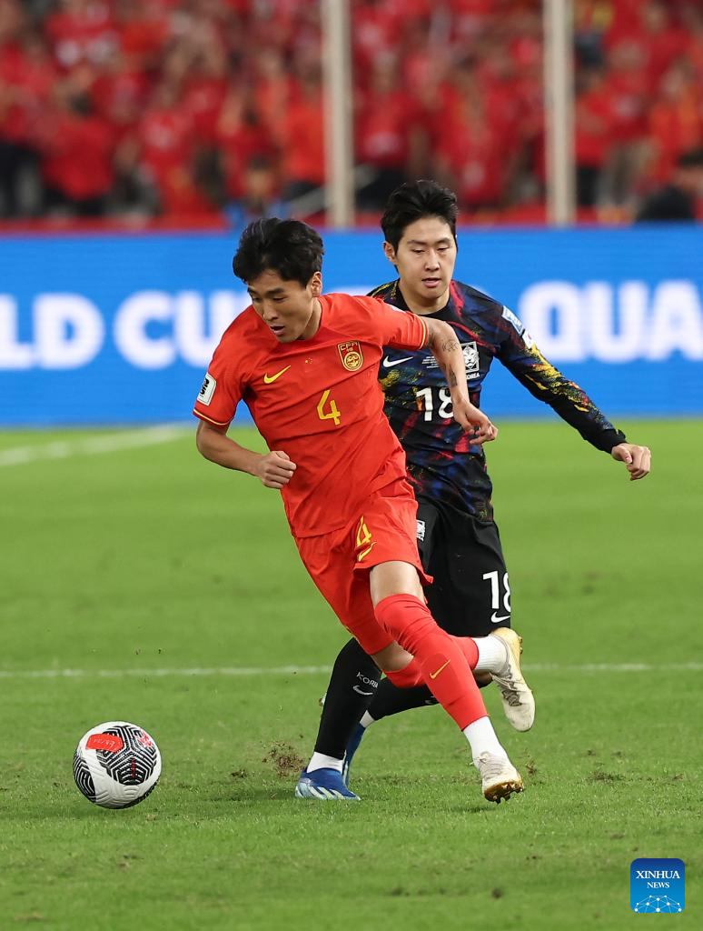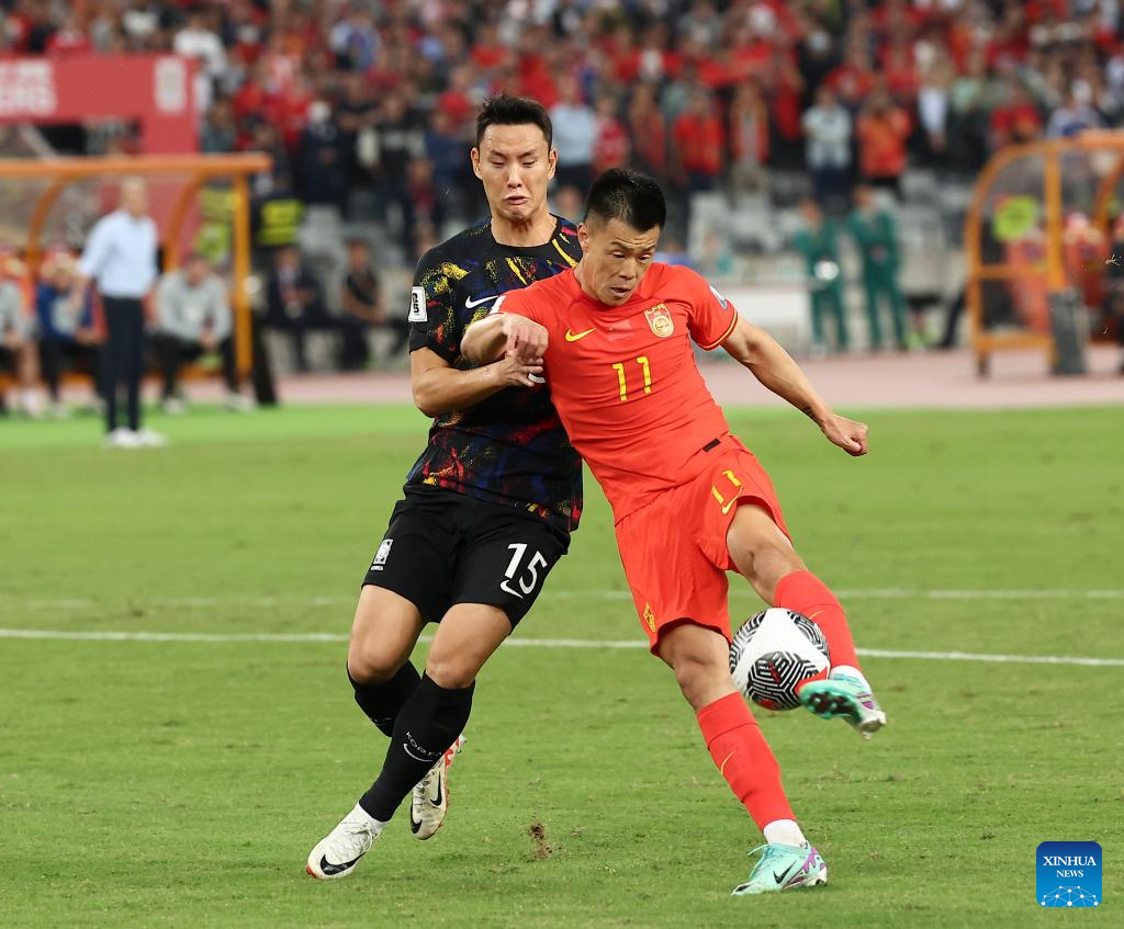 Wu Xi (L) of China vies with Lee Kangin of South Korea during the Group C match between China and South Korea at the 2026 FIFA World Cup Asian qualifier in Shenzhen, south China's Guangdong Province, Nov. 21, 2023. (Xinhua/Mao Siqian)