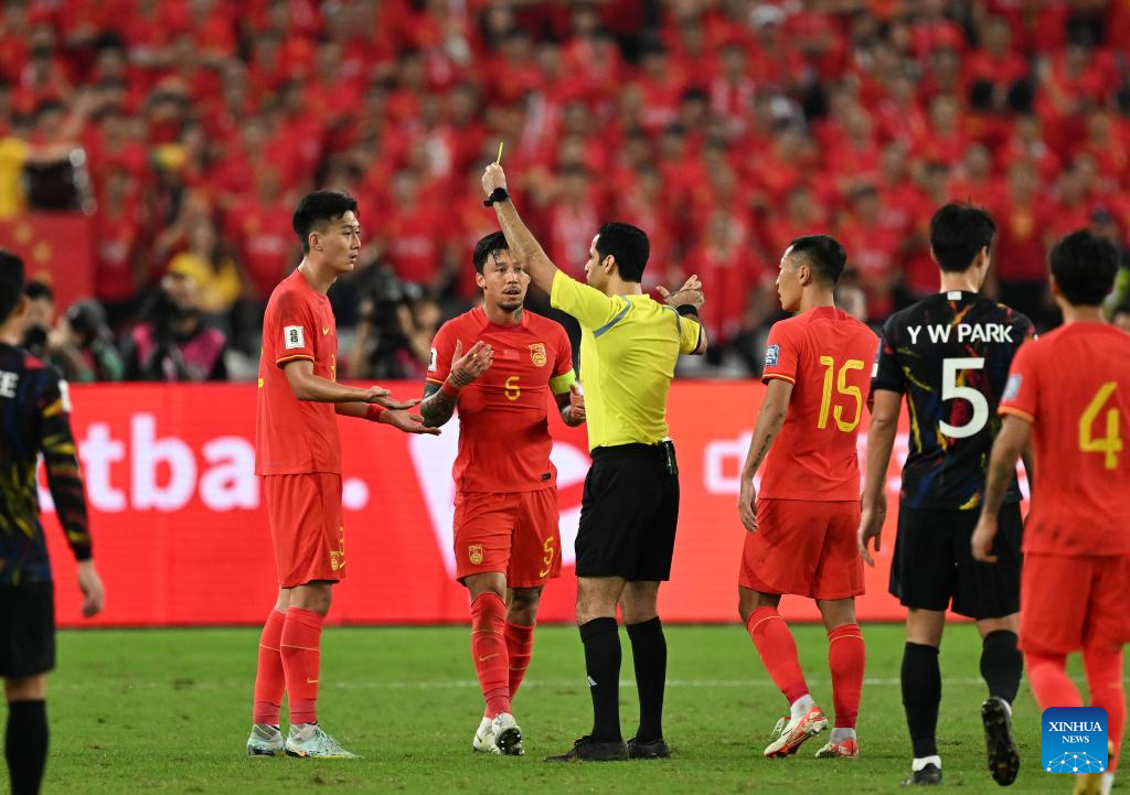 Referee Abdulrahman Al Jassim (C) shows yellow card to Jiang Shenglong (1st L) of China during the Group C match between China and South Korea at the 2026 FIFA World Cup Asian qualifier in Shenzhen, south China's Guangdong Province, Nov. 21, 2023. (Xinhua/Mao Siqian)