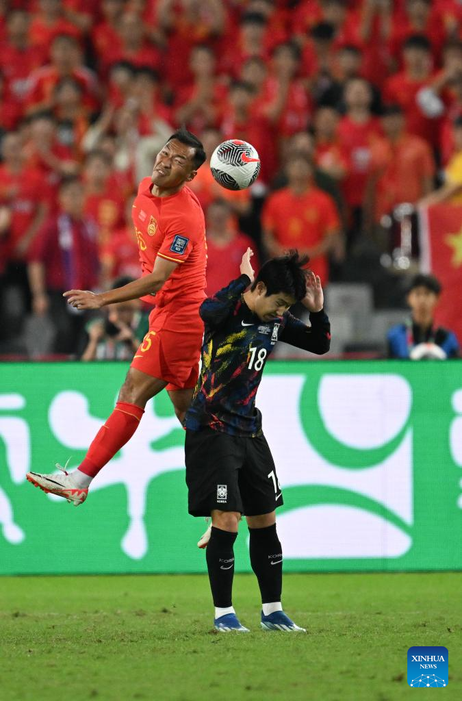 Cho Guesung (top R) of South Korea vies for a header with Zhang Linpeng (top C) of China during the Group C match between China and South Korea at the 2026 FIFA World Cup Asian qualifier in Shenzhen, south China's Guangdong Province, Nov. 21, 2023. (Xinhua/Jia Haocheng)