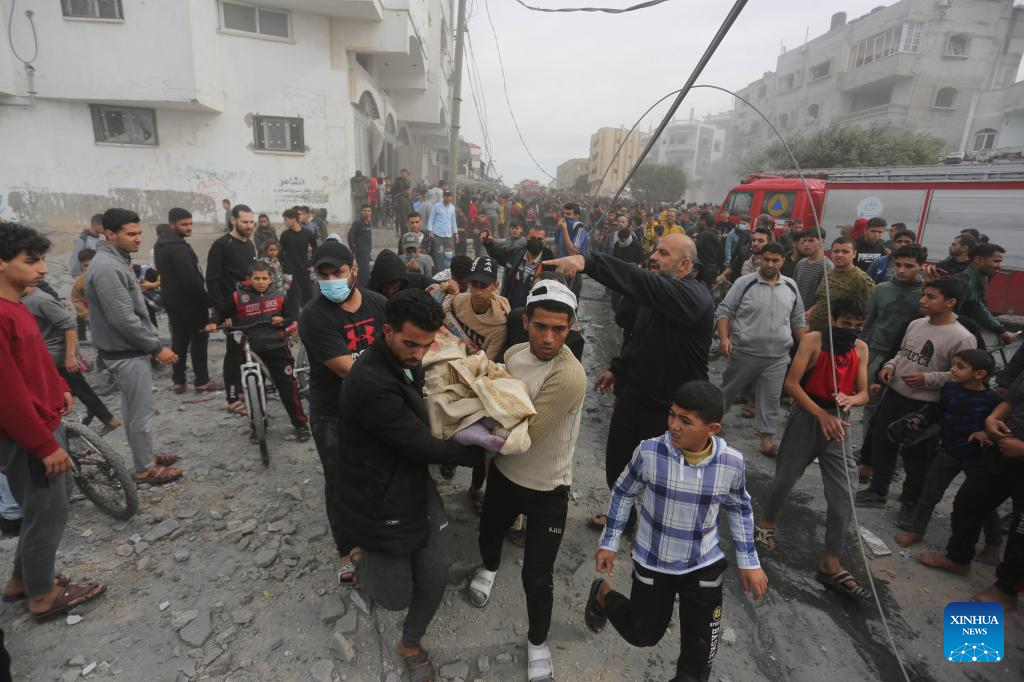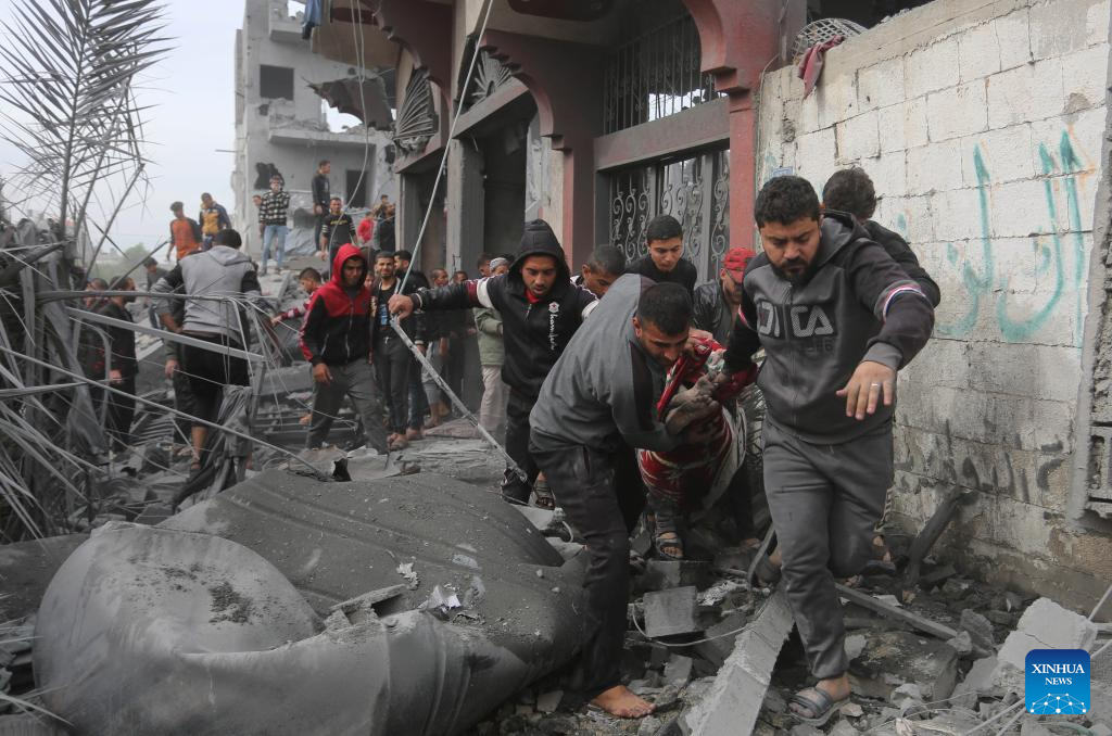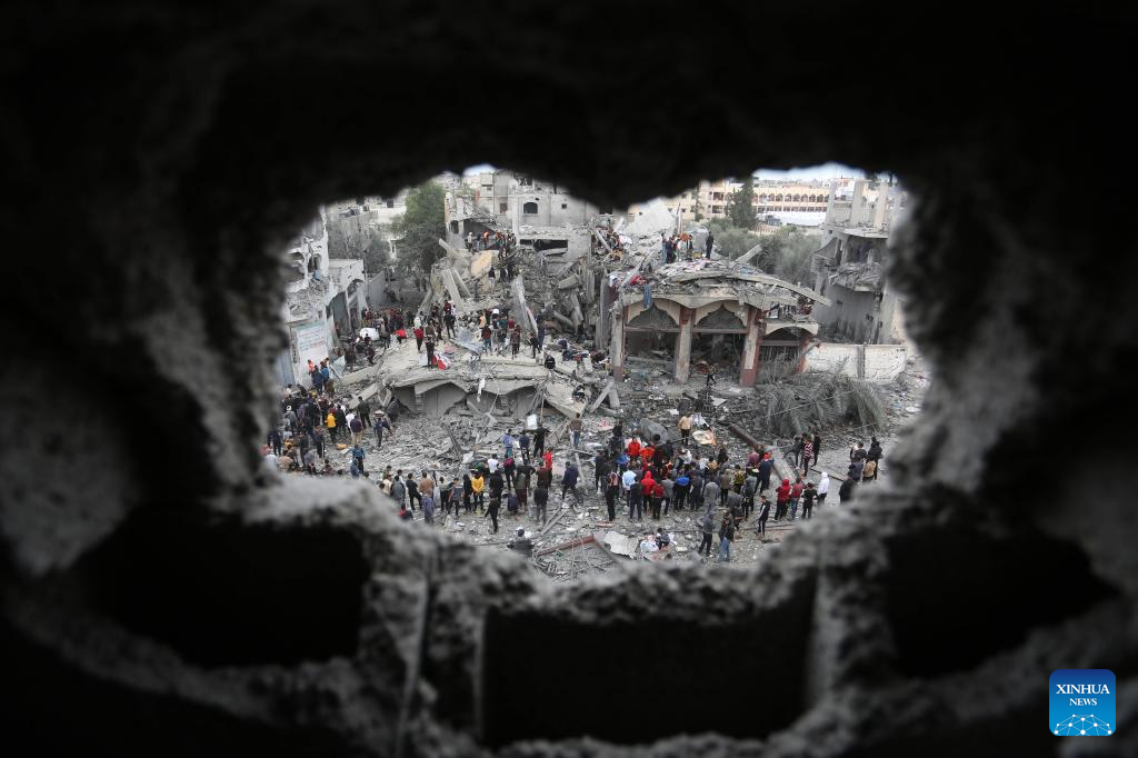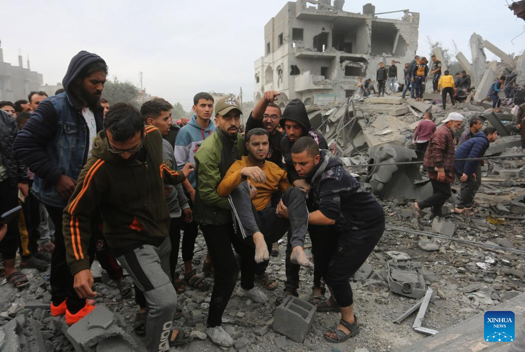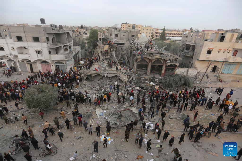People conduct rescue work among the rubble of buildings destroyed in Israeli airstrikes in the southern Gaza Strip city of Rafah, on Nov. 22, 2023. Israel and the Gaza-ruling Islamic Resistance Movement (Hamas) confirmed Wednesday a cease-fire agreement in the conflict-ridden Gaza Strip for four days, to allow for more aid delivery to Gaza as well as the exchange of Israeli hostages held by the armed Palestinian faction and Palestinian prisoners jailed in Israel. (Photo by Khaled Omar/Xinhua)