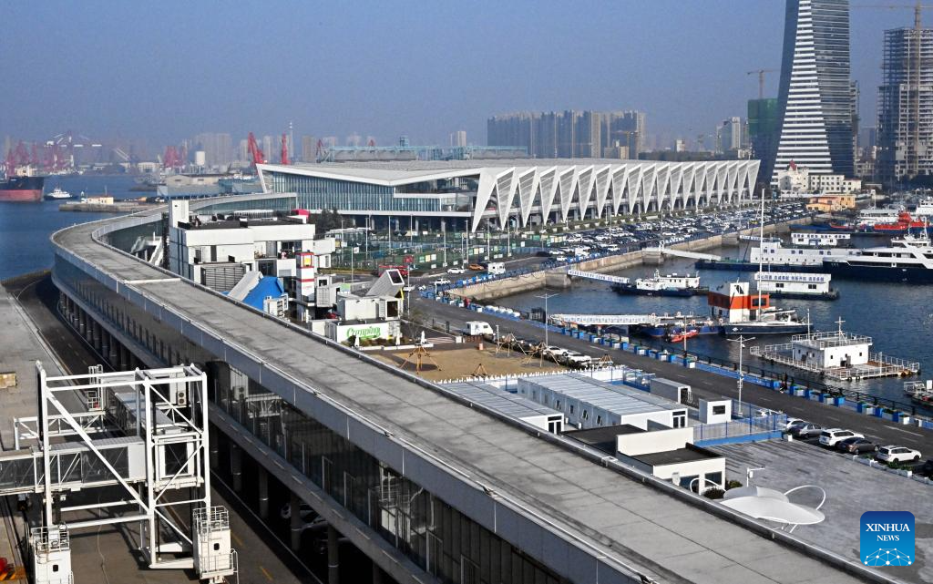 This aerial photo taken on Nov. 21, 2023 shows the passenger transportation center of Qingdao Cruise Terminal in Qingdao, east China's Shandong Province. Qingdao has been vigorously developing its cruise tourism service. As cruise voyages become increasingly frequent along with a climbing number of inbound tourists, they also contribute to the sustainable development of related sectors in the city. To date, Qingdao is connected by 40 international cruise lines to nearly 20 port cities. (Xinhua/Li Ziheng)