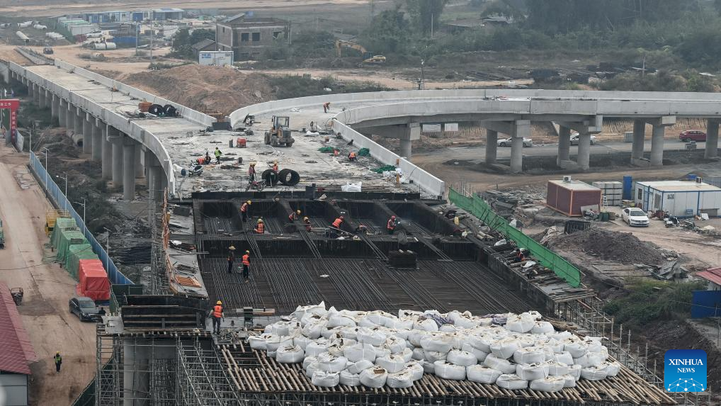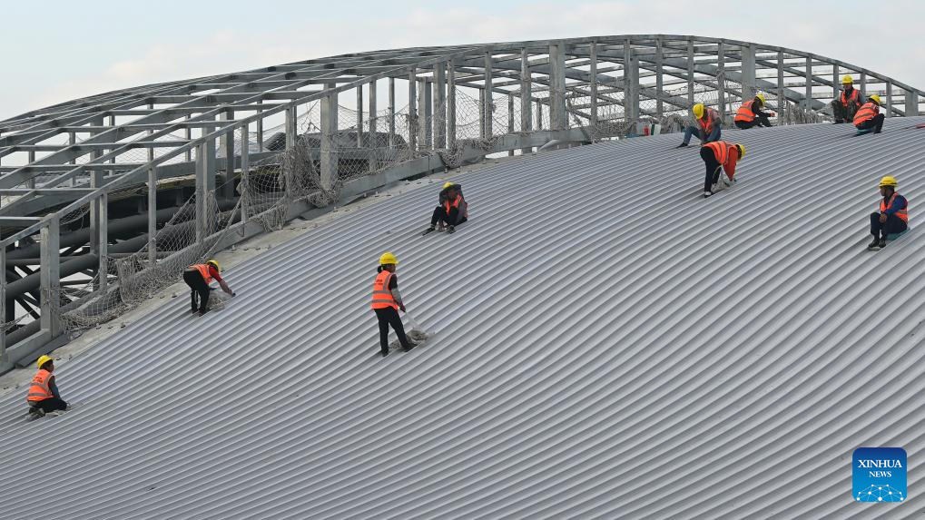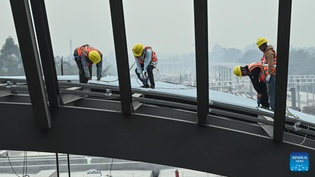 Workers work at the construction site of Yulin North Railway Station in Yulin, south China's Guangxi Zhuang Autonomous Region, Nov. 22, 2023. Yulin North Railway Station is one of the stations along the Nanning-Yulin high-speed railway with a designed speed of 350 kilometers per hour. (Xinhua/Zhang Ailin)