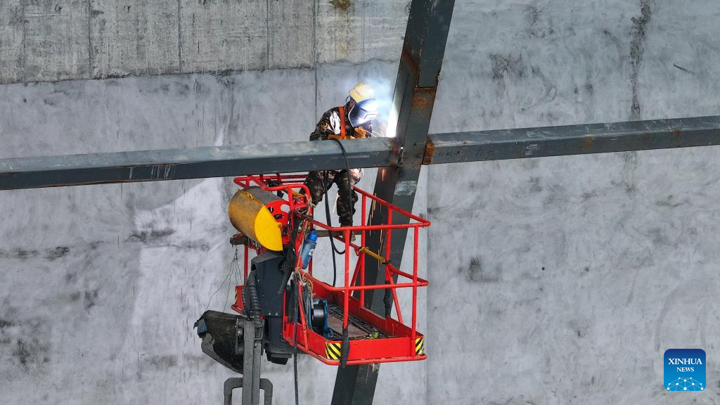 This aerial photo taken on Nov. 22, 2023 shows a worker conducting a welding operation at the construction site of Yulin North Railway Station in Yulin, south China's Guangxi Zhuang Autonomous Region. Yulin North Railway Station is one of the stations along the Nanning-Yulin high-speed railway with a designed speed of 350 kilometers per hour. (Xinhua/Zhang Ailin)