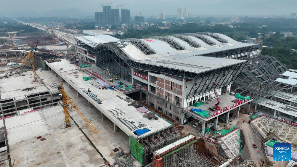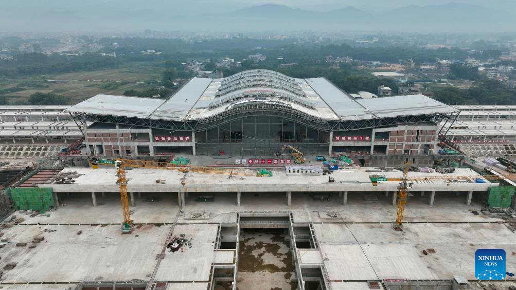 This aerial photo taken on Nov. 22, 2023 shows the construction site of Yulin North Railway Station in Yulin, south China's Guangxi Zhuang Autonomous Region. Yulin North Railway Station is one of the stations along the Nanning-Yulin high-speed railway with a designed speed of 350 kilometers per hour. (Xinhua/Zhang Ailin)