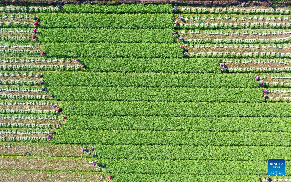 This aerial photo taken on Nov. 22, 2023 shows farmers harvesting vegetable in Shiqiaotou township of Wenling City, east China's Zhejiang Province. (Photo by Liu Zhenqing/Xinhua)