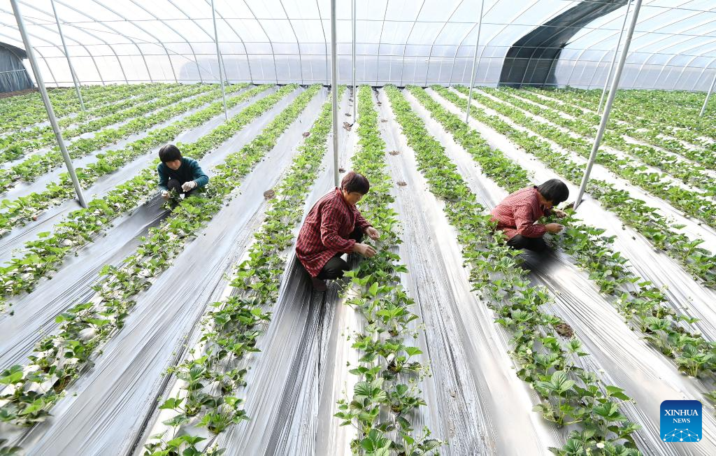 Villagers take care of strawberries in a greenhouse in Beibaidao village of Jiangwucheng township, Cixian County of Handan City, north China's Hebei Province, Nov. 22,2023. (Photo by Hao Qunying/Xinhua)
