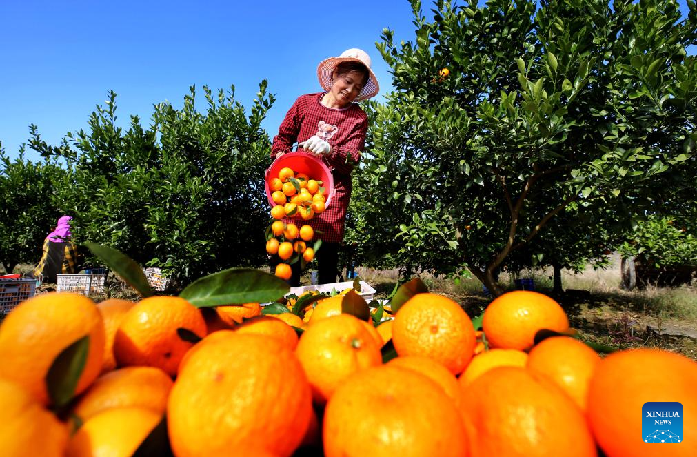 A villager collects mandarin oranges in Maocaozhai village of Xiaozhaiba township, Xifeng County, southwest China's Guizhou Province, Nov. 22, 2023. (Photo by Yuan Fuhong/Xinhua)