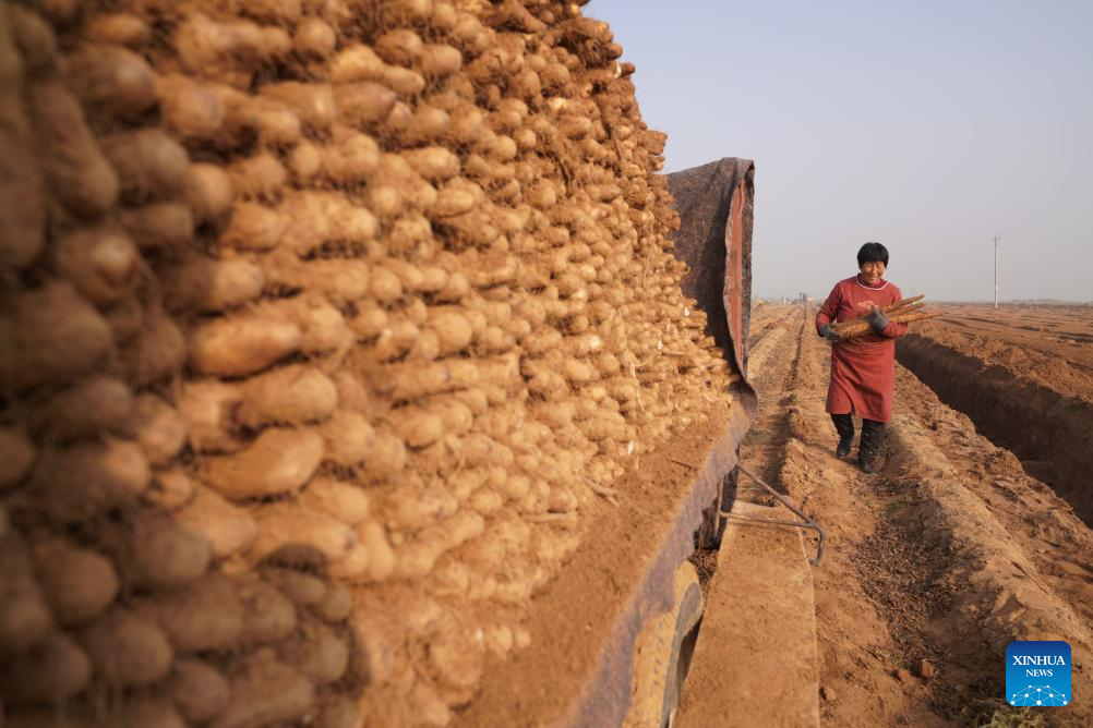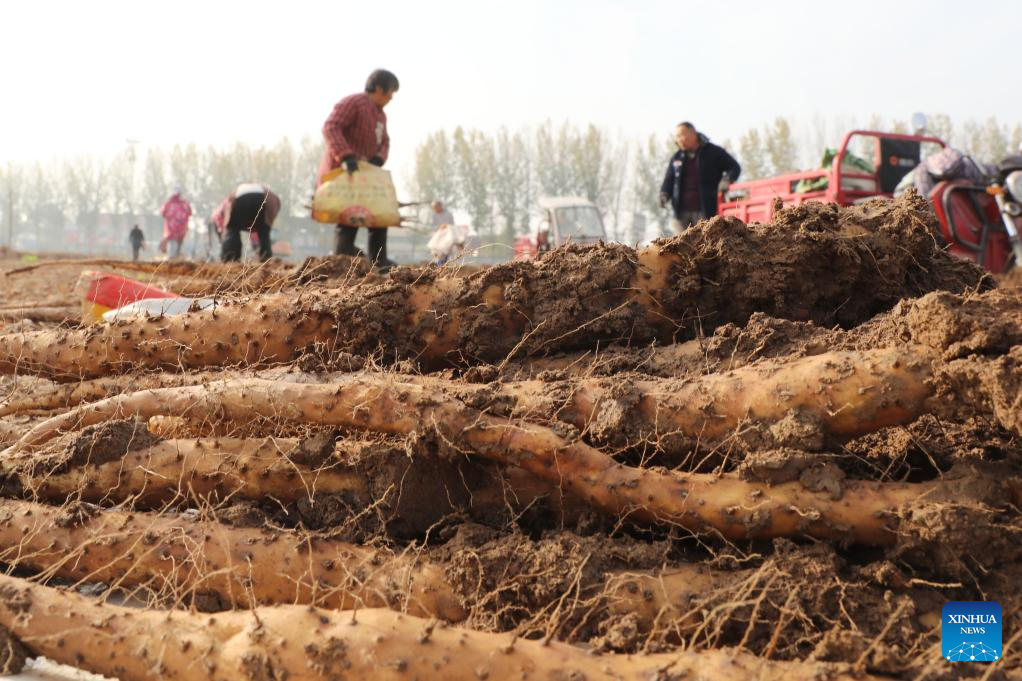 A farmer collects Chinese yam in Jindian township of Neiqiu County, Xingtai City, north China's Hebei Province, Nov. 22, 2023. (Photo by Liu Jidong/Xinhua)