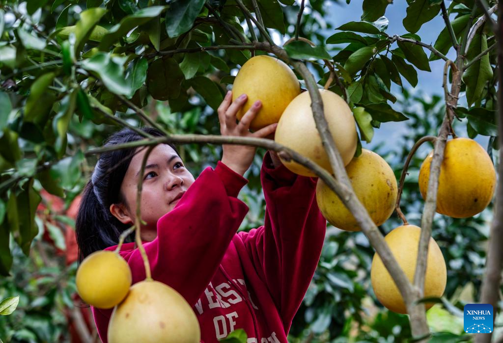 A villager collects pomelos in Liangfeng village of Zhongping township, Qianxi City, southwest China's Guizhou Province, Nov. 22, 2023. (Photo by Fan Hui/Xinhua)