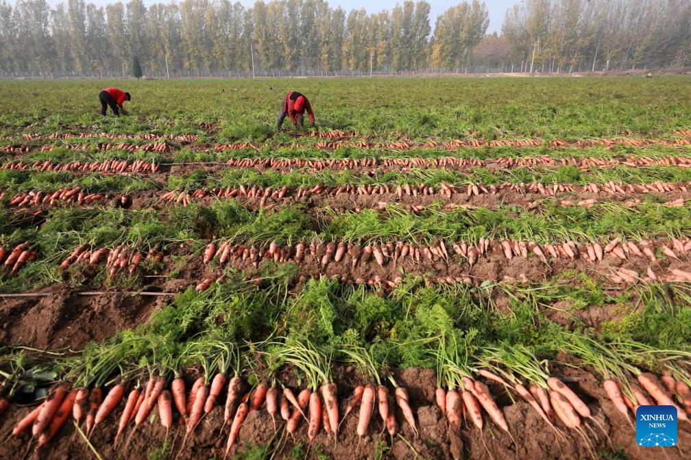 Farmers harvest carrots in Renze District of Xingtai City, north China's Hebei Province, Nov. 22, 2023. (Photo by Song Jie/Xinhua)