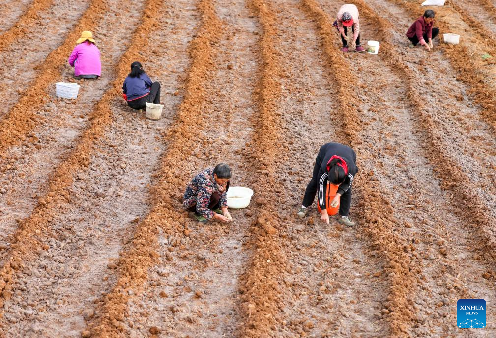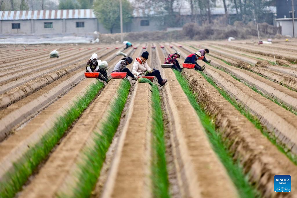 Villagers plant green onion sprouts in Sunjia village, Qingzhou City, east China's Shandong Province, Nov. 22, 2023. (Photo by Wang Jilin/ Xinhua)