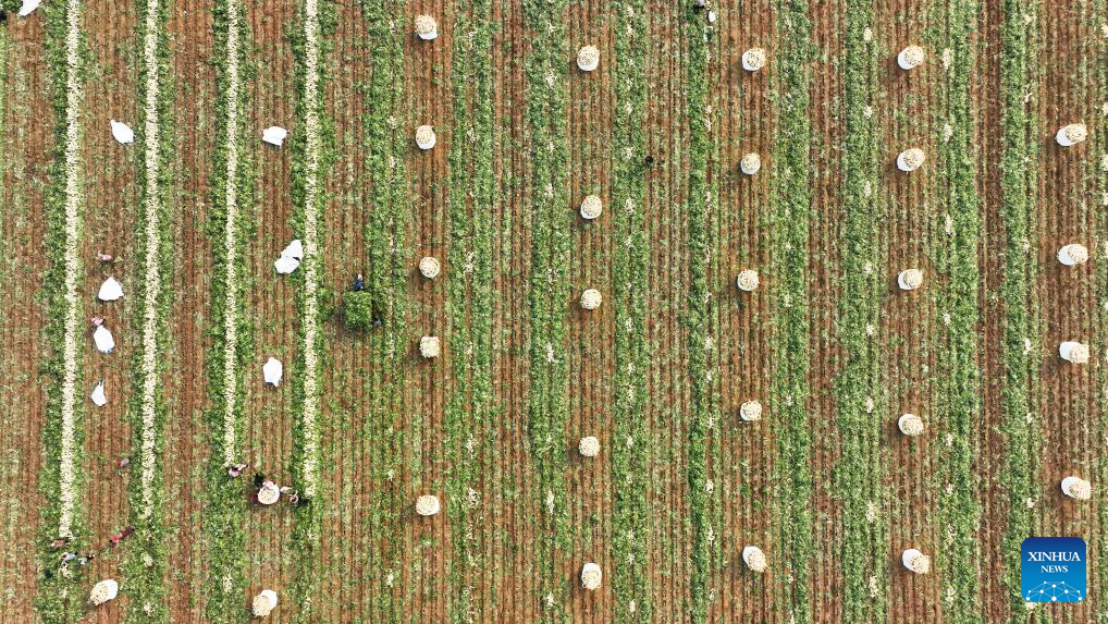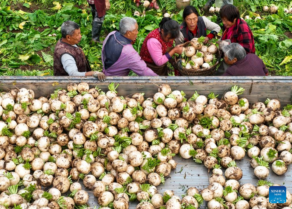 This aerial photo taken on Nov. 22, 2023 shows villagers harvesting white radishes in Sanyuanguan village of Pingtou township, Peng'an County in Nanchong City, southwest China's Sichuan Province. (Photo by Liu Yonghong/Xinhua)