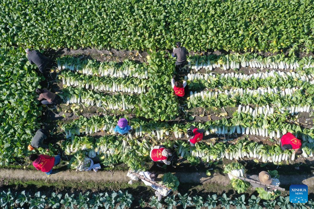 This aerial photo taken on Nov. 22, 2023 shows volunteers helping villagers to harvest vegetables in Jinhuo village of Qianyuan township, Deqing County of Huzhou City, east China's Zhejiang Province. (Photo by Ni Lifang/Xinhua)