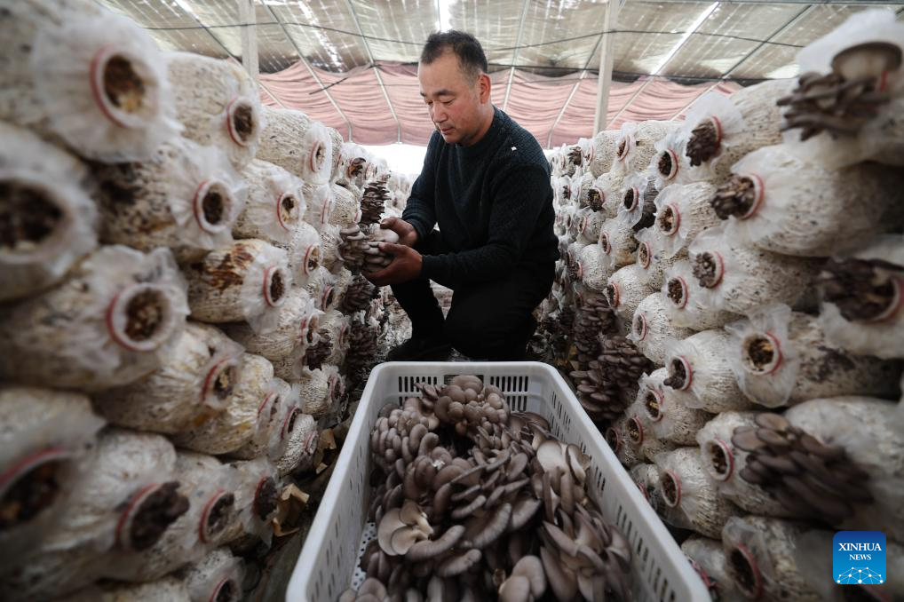 A farmer harvests mushrooms in a greenhouse in Lingshan village of Tongjing township, Yinan County in Linyi City, east China's Shandong Province, Nov. 22, 2023. (Photo by Wang Yanbing/Xinhua)
