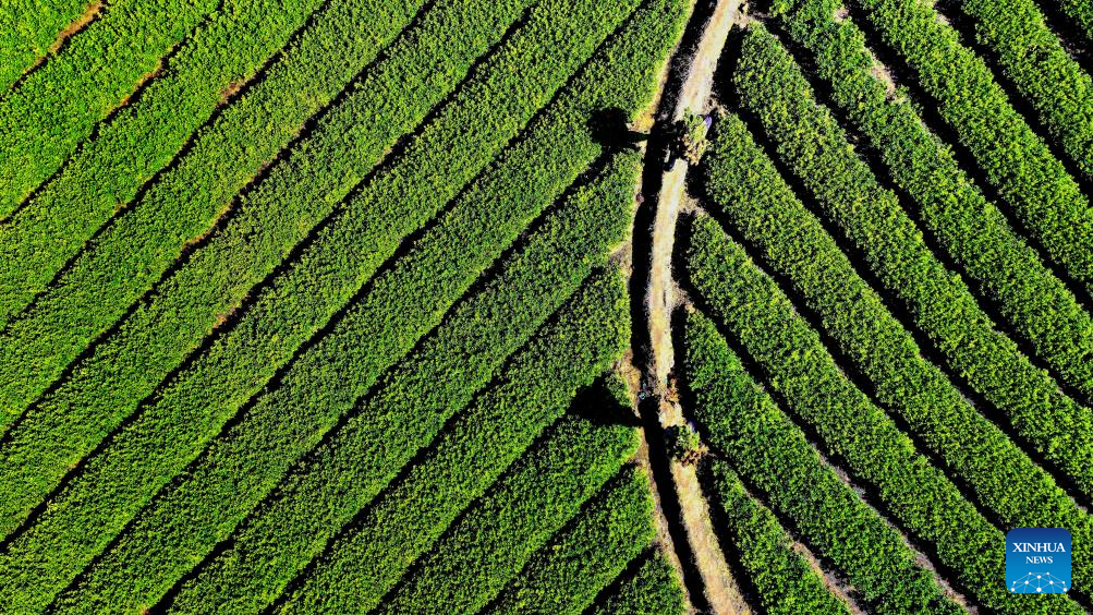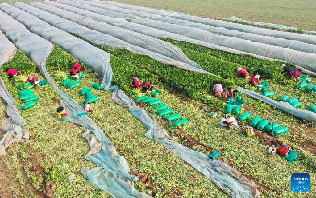 This aerial photo taken on Nov. 22, 2023 shows farmers harvesting the celery in Sanzhao township of Xingtai City, north China's Hebei Province. (Photo by Zhang Chi/Xinhua)
