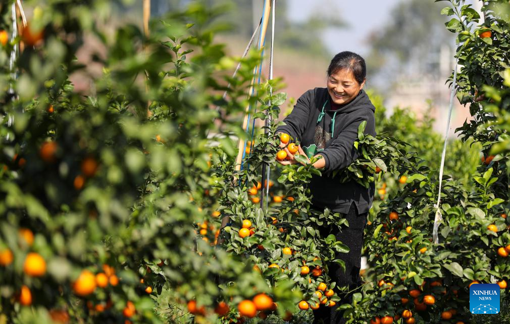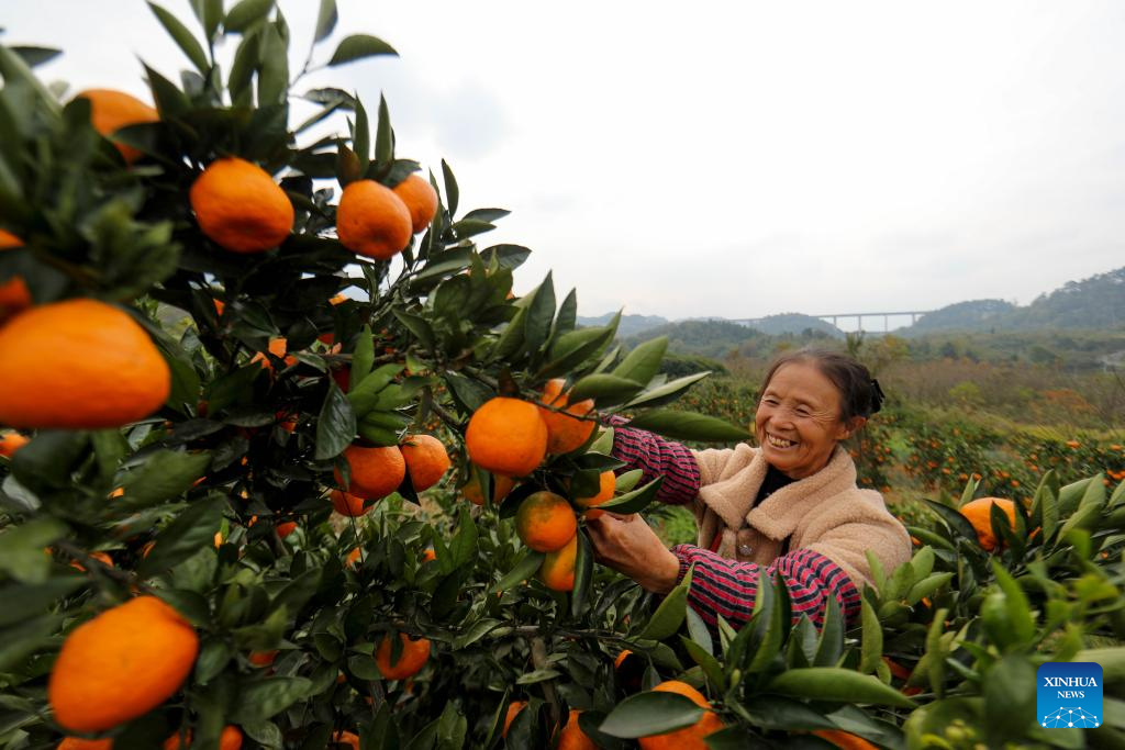 A villager collects mandarin oranges in Chencun village of Luochang township, Gaoxian County of Yibin City, southwest China's Sichuan Province, Nov. 22, 2023. (Photo by Zhuang Ge'er)