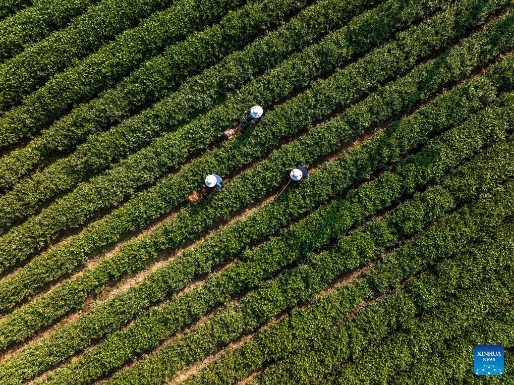 This aerial photo taken on Nov. 22, 2023 shows farmers working in a tea plantation in Jiandong village of Maoping township, Zigui County of Yichang City, central China's Hubei Province. (Photo by Wang Gang/Xinhua)