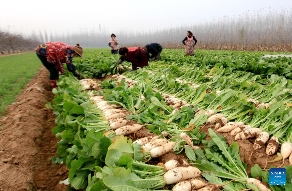 Farmers harvest white radishes in Difang township of Pingyi County, Linyi City, east China's Shandong Province, Nov. 22,2023. (Photo by Wu Jiquan/Xinhua)