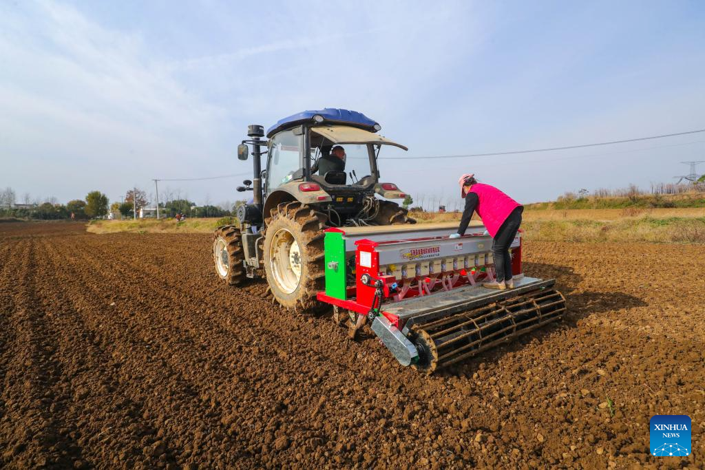 Farmers plant wheat in a planting base in Shili township of Guangshan County, Xinyang City, central China's Henan Province, Nov. 22, 2023. (Photo by Xie Wanbai/Xinhua)