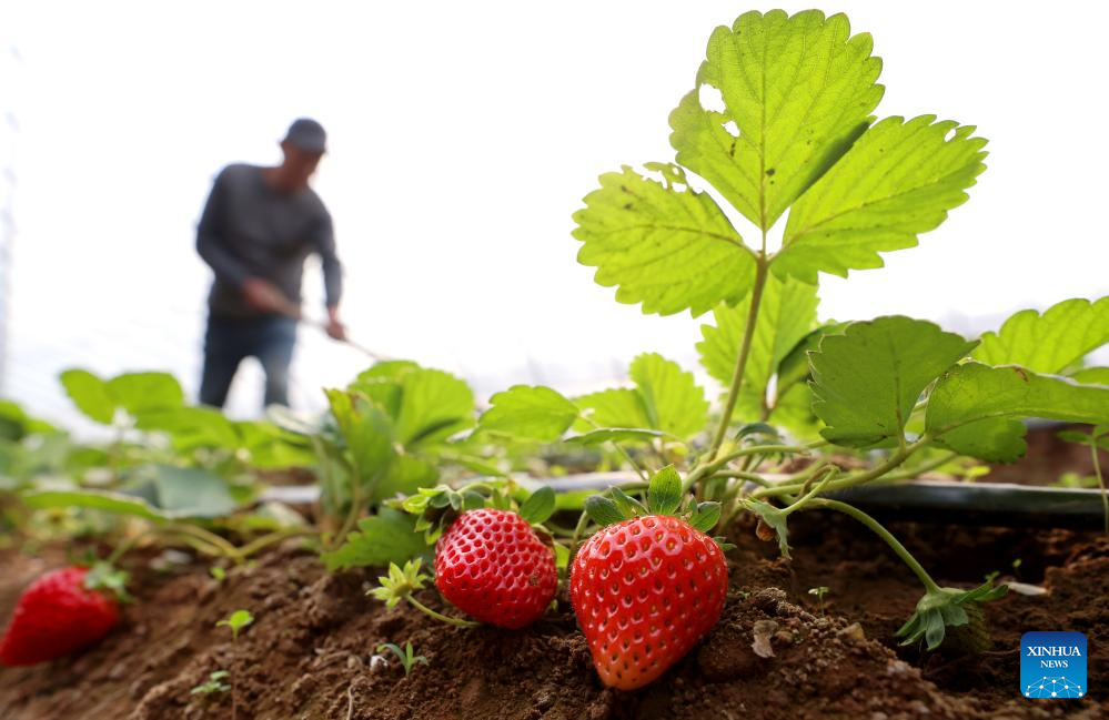 Strawberries are seen as a villager works in a greenhouse in Liutun village of Yong 'an township, Zaozhuang City, east China's Shandong Province, Nov. 22, 2023. (Photo by Sun Zhongzhe/Xinhua)