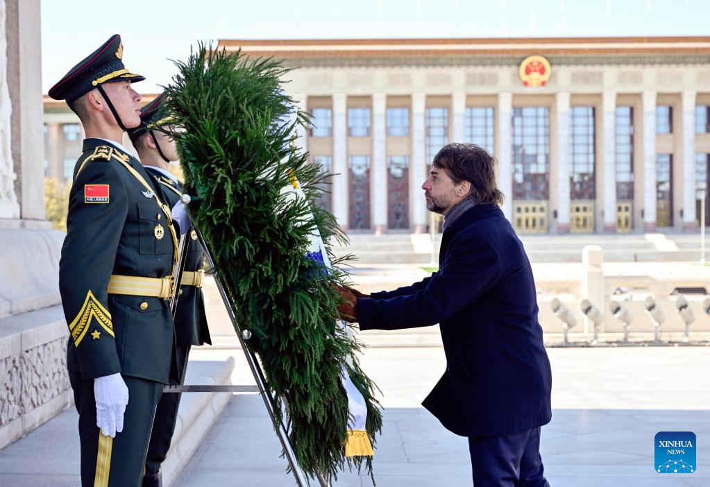 Uruguayan President Luis Alberto Lacalle Pou lays a wreath at the Monument to the People's Heroes on the Tian'anmen Square in Beijing, capital of China, Nov. 23, 2023. (Xinhua/Yin Bogu)