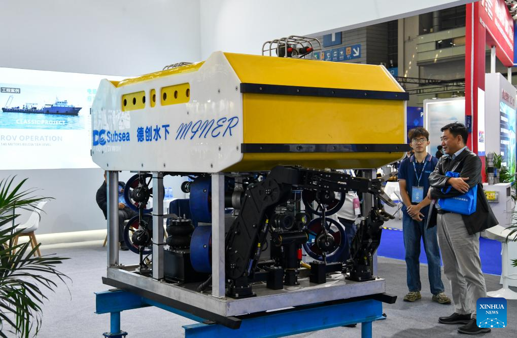 Visitors learn about an underwater robot during the 2023 China Marine Economy Expo (CMEE) in Shenzhen, south China's Guangdong Province, Nov. 23, 2023. The 2023 CMEE under the theme of "Open Cooperation and Win-win Sharing" kicked off in Shenzhen on Thursday. (Xinhua/Liang Xu)