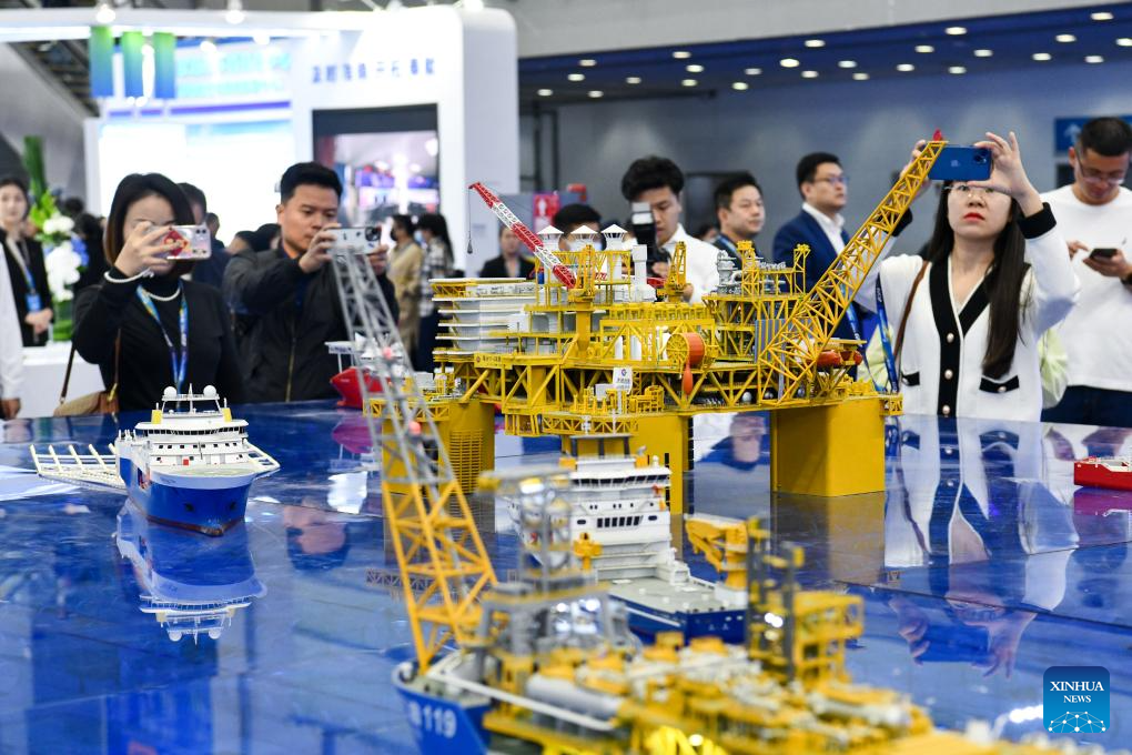 Visitors learn about a model of drilling platform during the 2023 China Marine Economy Expo (CMEE) in Shenzhen, south China's Guangdong Province, Nov. 23, 2023. The 2023 CMEE under the theme of "Open Cooperation and Win-win Sharing" kicked off in Shenzhen on Thursday. (Xinhua/Liang Xu)