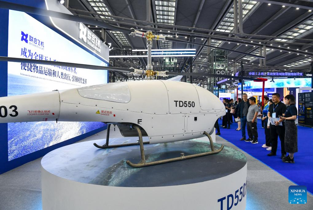 Visitors learn about an unmanned helicopter during the 2023 China Marine Economy Expo (CMEE) in Shenzhen, south China's Guangdong Province, Nov. 23, 2023. The 2023 CMEE under the theme of "Open Cooperation and Win-win Sharing" kicked off in Shenzhen on Thursday. (Xinhua/Liang Xu)