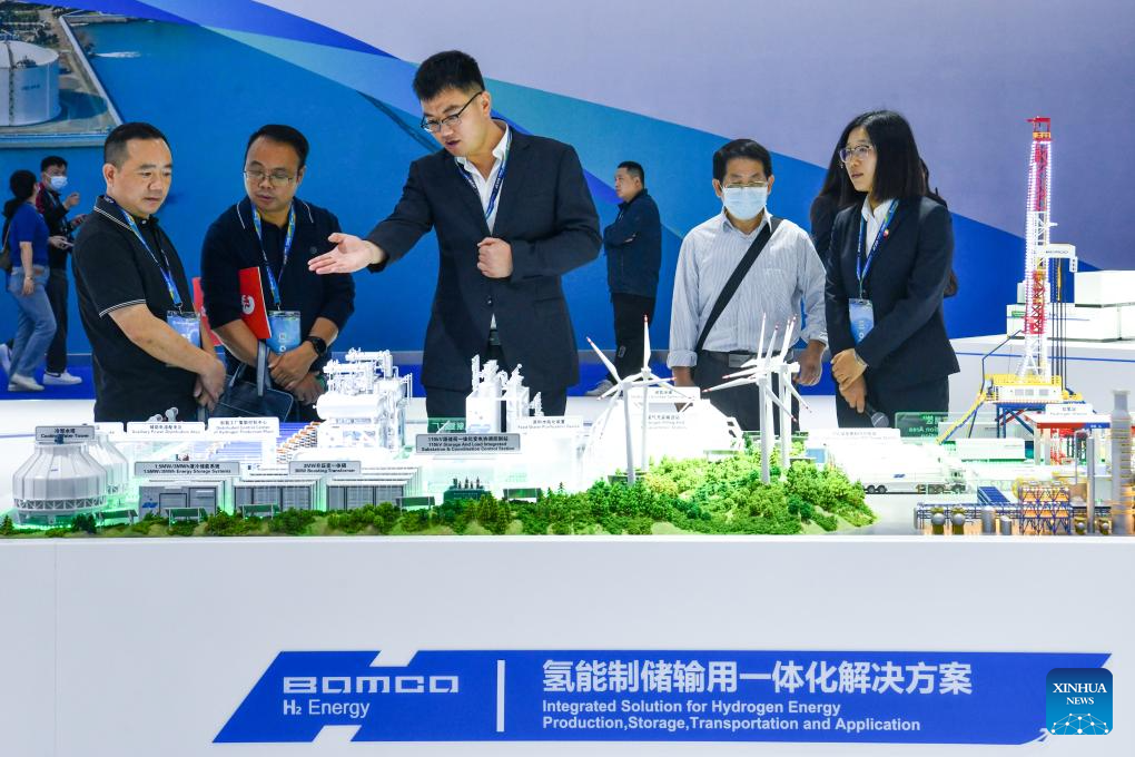 Visitors learn about the integrated solution for hydrogen energy production, storage, transportation and application during the 2023 China Marine Economy Expo (CMEE) in Shenzhen, south China's Guangdong Province, Nov. 23, 2023. The 2023 CMEE under the theme of "Open Cooperation and Win-win Sharing" kicked off in Shenzhen on Thursday. (Xinhua/Liang Xu)
